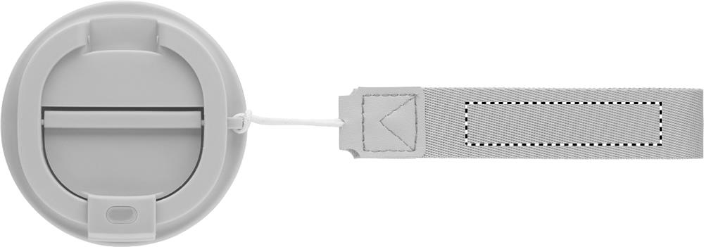 Mugg med dubbelvägg i återvunnet rostfritt stål (90 % återvunnet rostfritt stål och 10 % rostfritt stål) med återvunnet PP-utsida och RPET-handledsrem. Läckagefri. Volym: 350 ml.