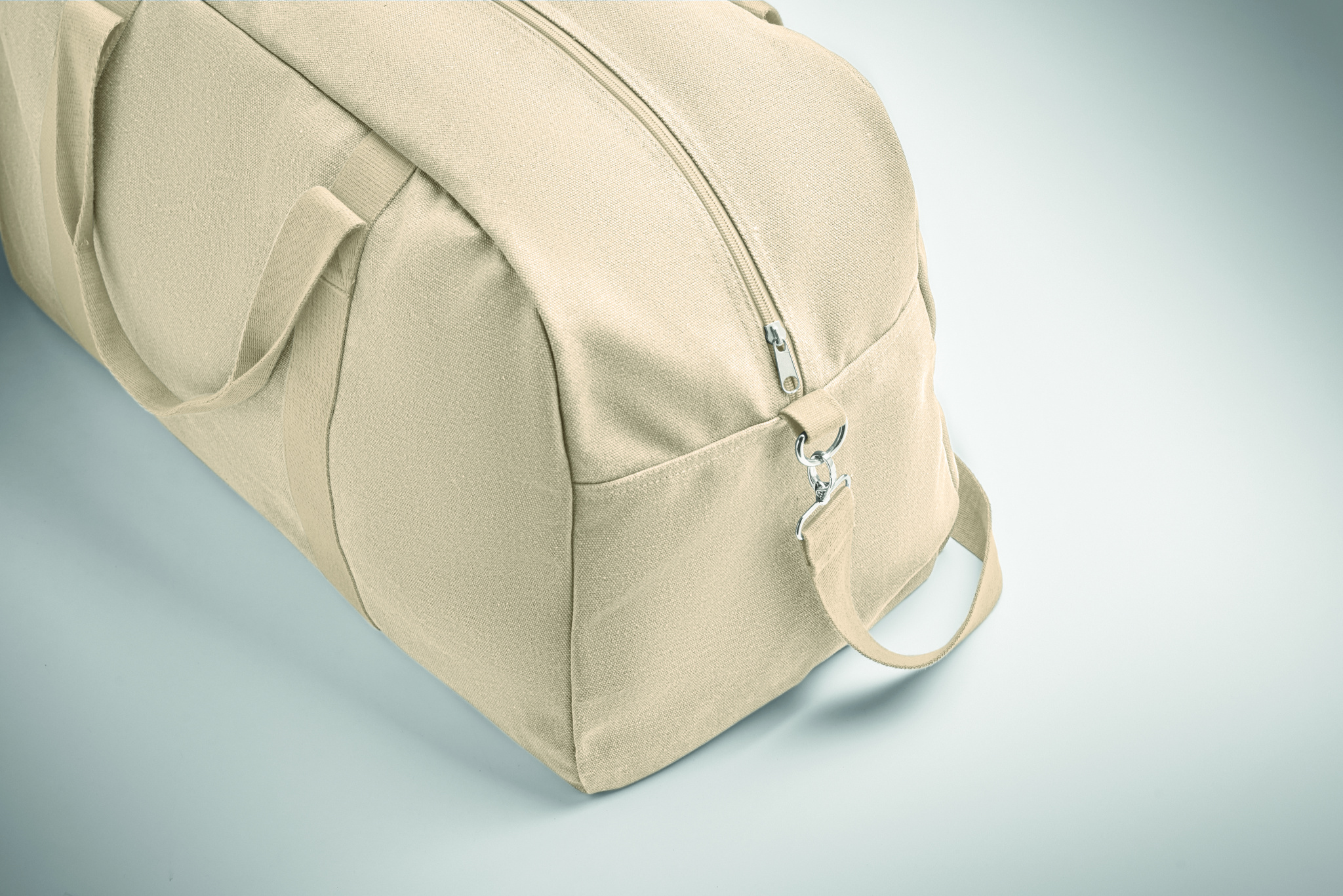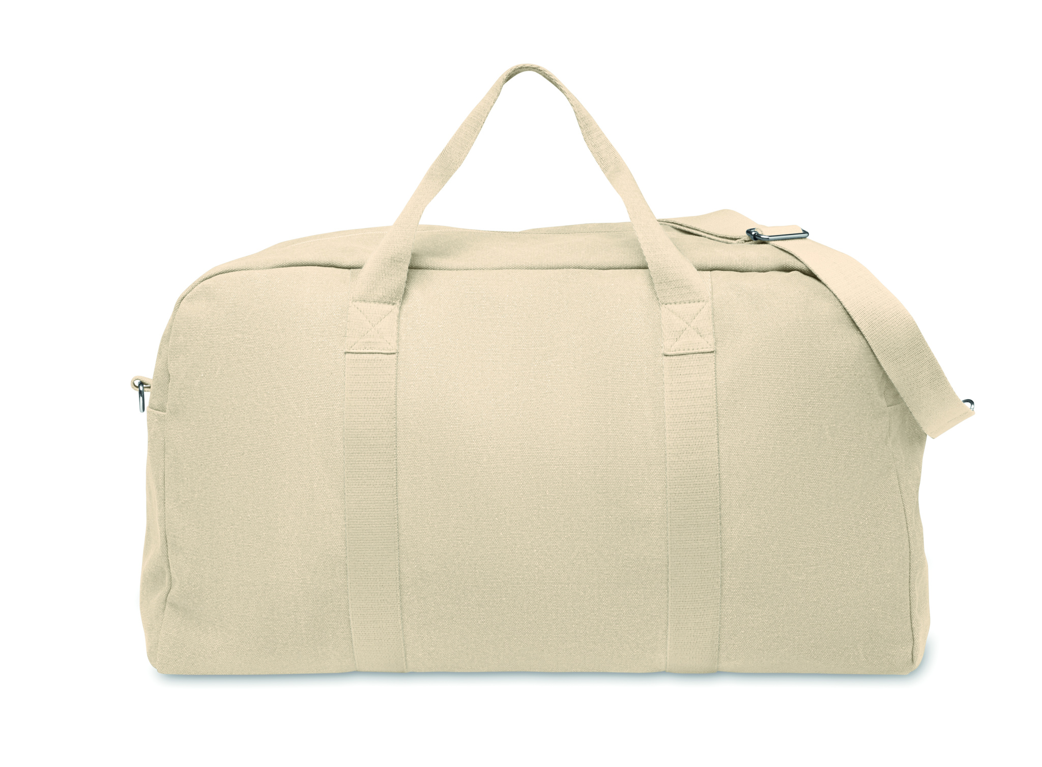 Duffelbag/väska i återvunnet 450 gr/m² tyg (60% återvunnen bomull och 40% återvunnen polyester) med justerbar och avtagbar bomullsrem.