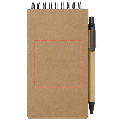 Självhäftande anteckningsblock med kulspetspenna. Anteckningsblocket har 30 ark vitt papper 70 g/m2 linjerat papper (8 x 12 cm). Den har också 25 flerfärgade (5 x 1,2 cm) och 25 gula (7,5 x 7,5 cm) klisterlappar, båda med 70 g/m2 papper. Kulspetspennans pennkropp är tillverkad av återvunnet papper. Bläckfärg: Svart. Skrivlängd: 1000 meter. NIB-storlek: 1,00 mm.