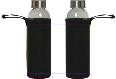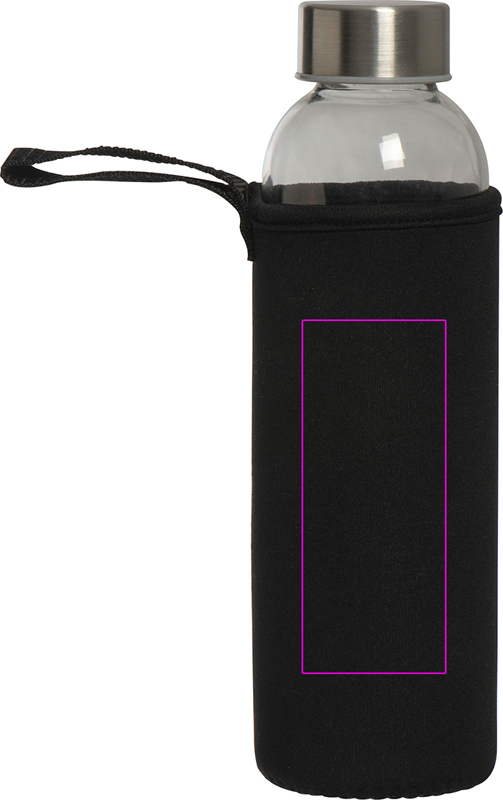 Läcksäker dricksflaska av glas med lock i rostfritt stål och en kapacitet på 500 ml. Flaskan levereras i matchande neoprenfodral med bärrem. Vi trycker din logotyp i mitten av ärmen. Gravering på locket eller flaskan och tryck på flaskan möjlig på begäran.