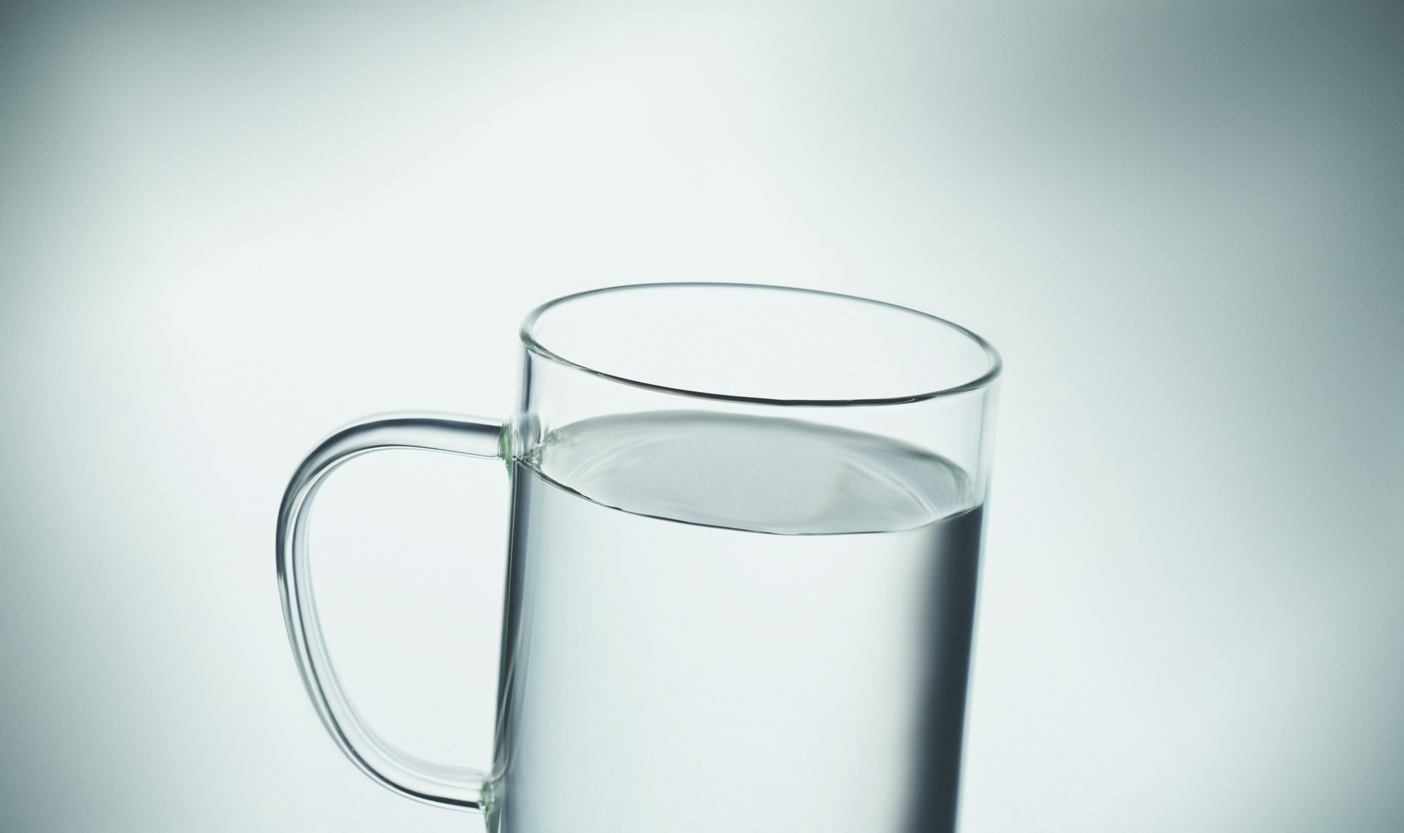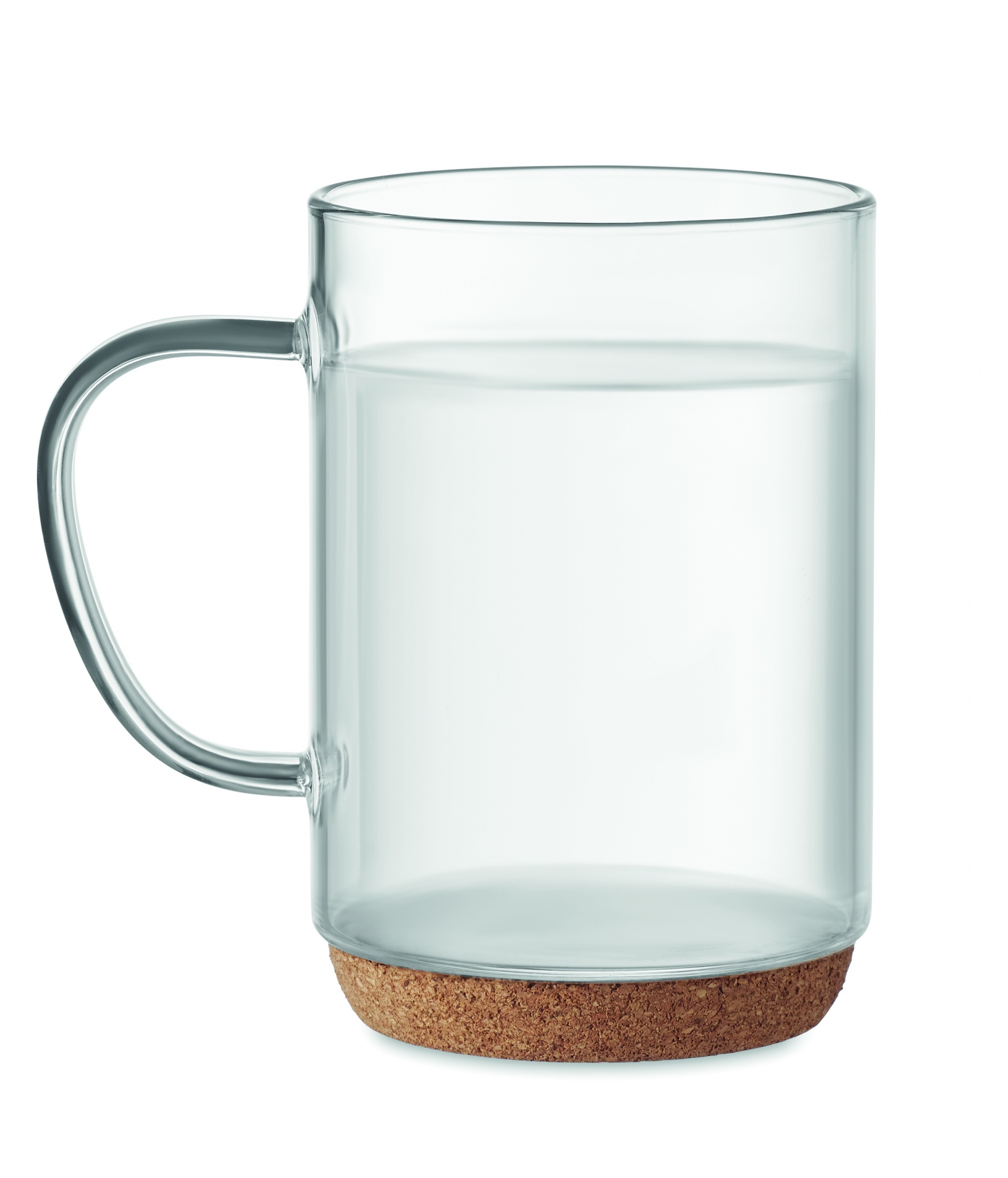 Mugg av borosilikatglas med korkbotten. Endast handdisk. Kapacitet: 400 ml.