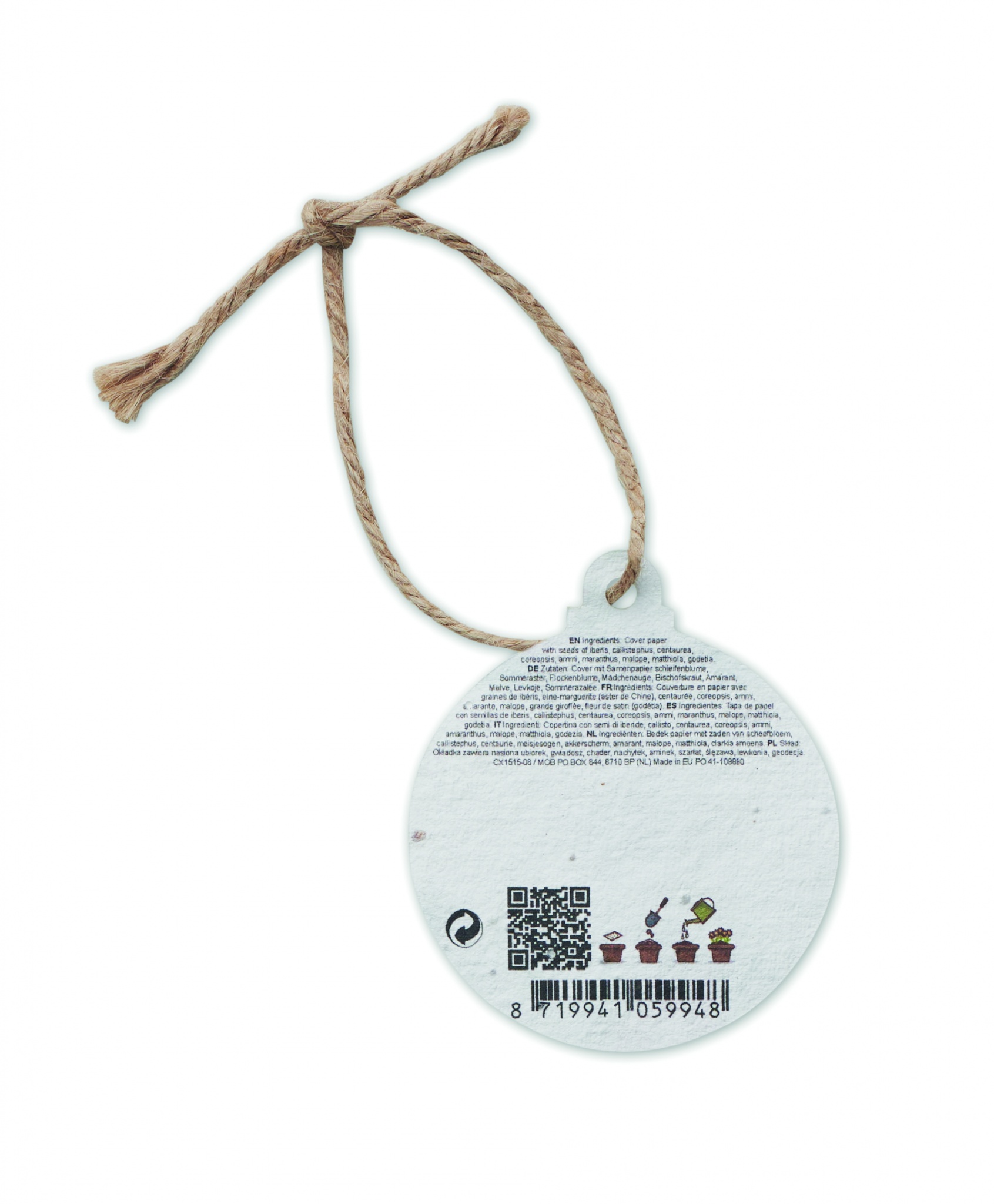 Mjukt fröpapper med fröblandning av vilda blommor i en julprydnadskula formad med jutesnöre. Efter användning kan du plantera pappret och se det växa till en äng med vilda blommor. Tillverkad i EU.