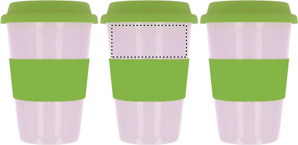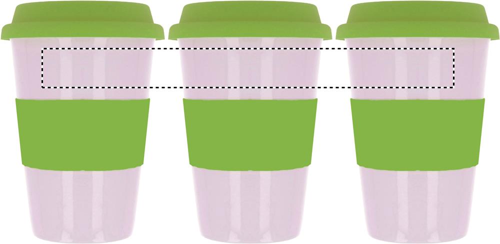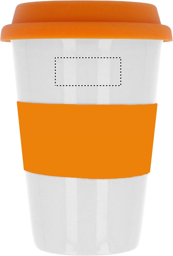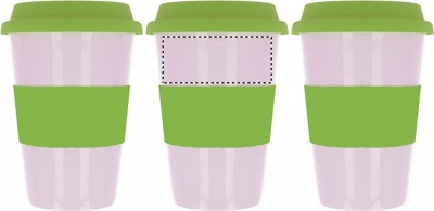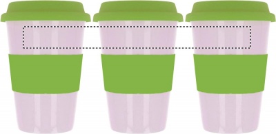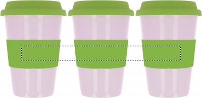 Keramik mugg med silikon lock och grepp för att skydda handen mot värmen. Innehåll 400 ml. Tampotryck tål inte diskmaskin. Keramik transfer tål diskmaskin.