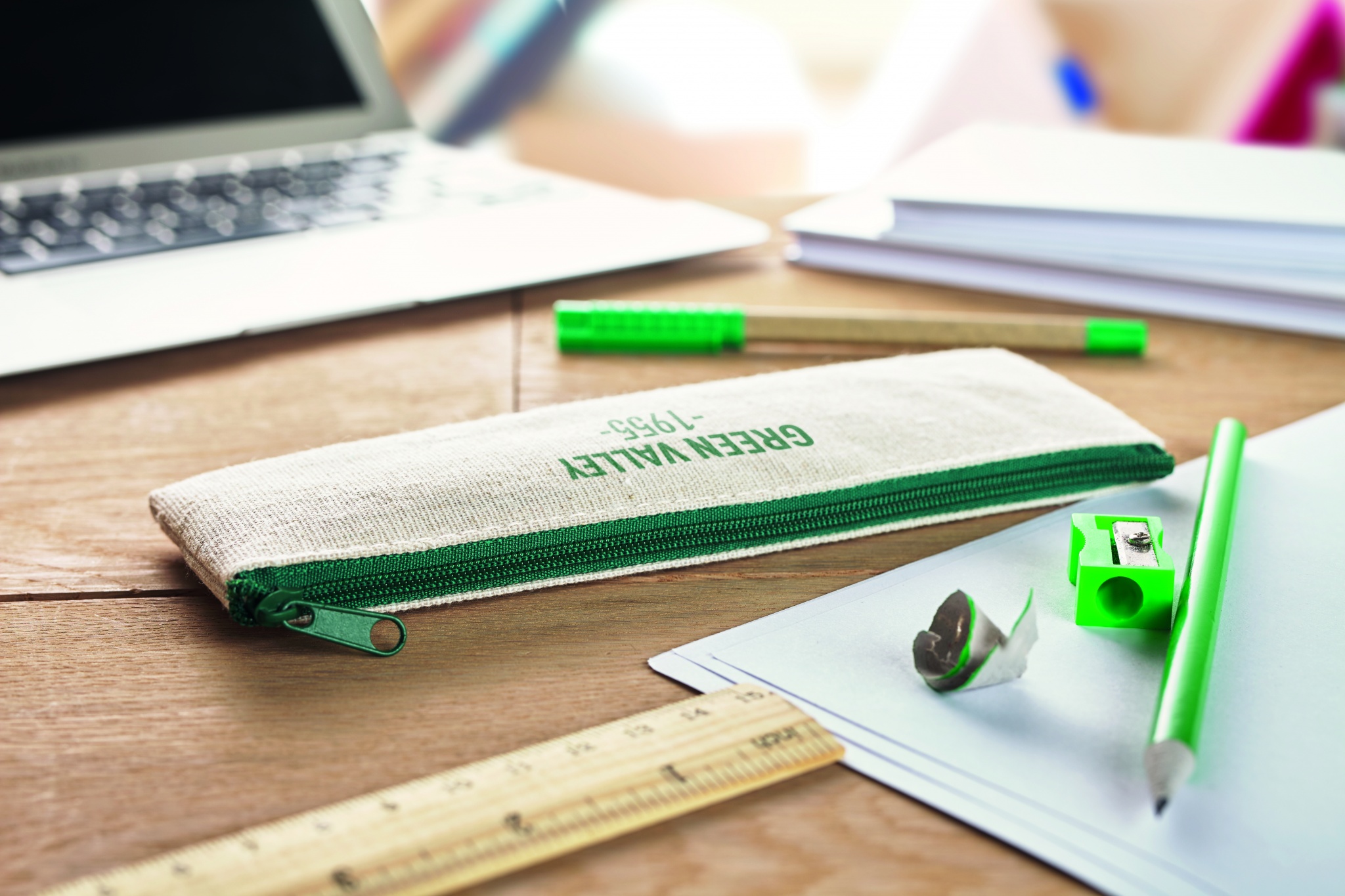 Kontorsset i 6 delar. Inkluderar en jute/bomulls påse, bambu linjal, pennvässare i trä, suddgummi, papperspenna och kulspetspenna, blått bläck.
