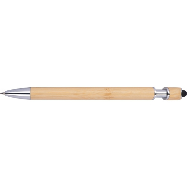 Bambu kulspetspenna med pekpenna. Kulspetspennan har silverplastaccenter, ett metallklämma och en blåskrivande jumbopåfyllning av plast.