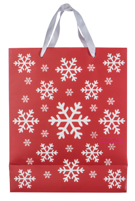 Julklappspåse av papper med snöflingadesign och två handtag. Vi trycker din logotyp på en etikett.