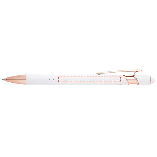 Kulspetspennan Nanna med finish i roséguld har en pennkropp av återvunnen aluminium och en touchpenna av silikon. Det återvunna aluminiumet minskar också mängden avfall i deponier och bidrar till att bevara naturresurser med syftet att minska växthusgasutsläppen. Bläckfärg: Blå. Skrivlängd: 800 meter. NIB-storlek: 1,0 mm.