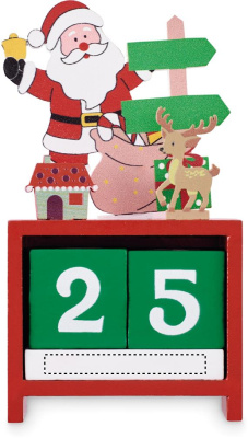 Skrivbordskalender med juldesign i trä.