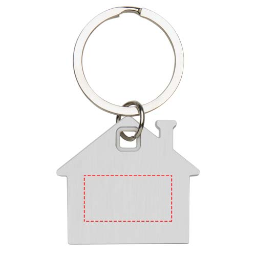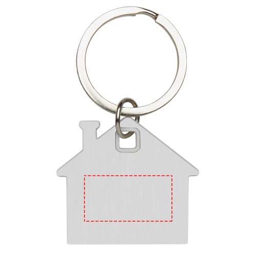 Husformad nyckelring med en platta av rostfritt stål med frostad design på fram- och baksidan samt ett färgat plastchip i mitten.