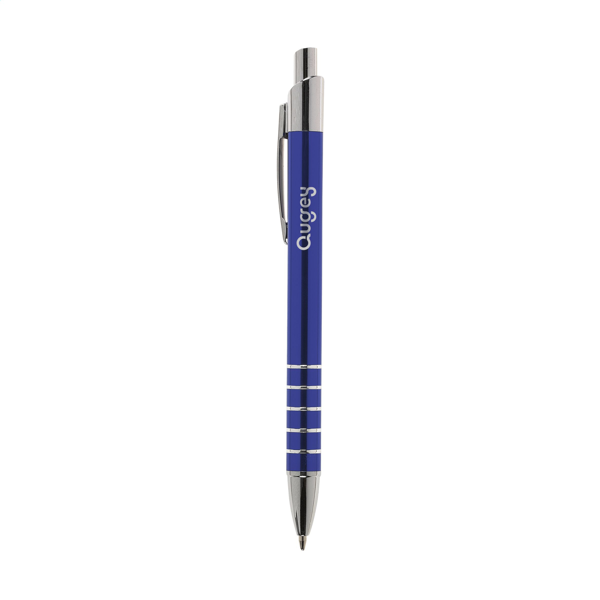 Blått bläck, kulspetspenna av aluminium i metalliskt utseende, med metallklämma och kantlister.