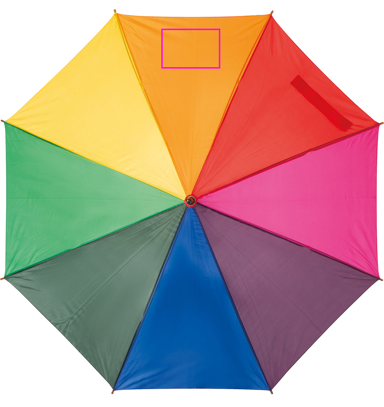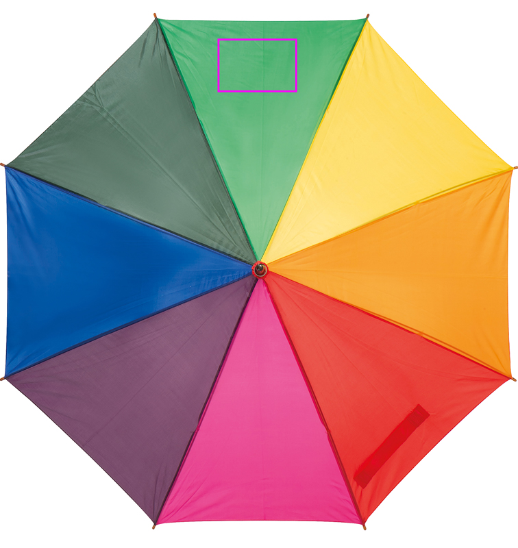 Attraktivt, flerfärgat automatiskt paraply med böjt trähandtag. Vi trycker din logotyp på ett segment.