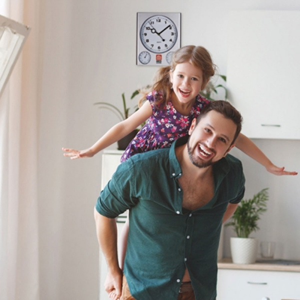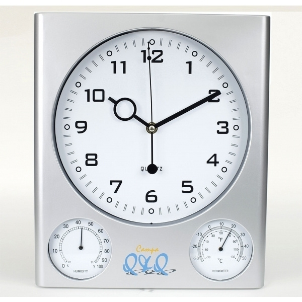 Elegant väggklocka med subtil vit urtavla och matt silveryta; visar tid, luftfuktighet och temperatur. Vi trycker din logotyp mellan hygro och termometer.