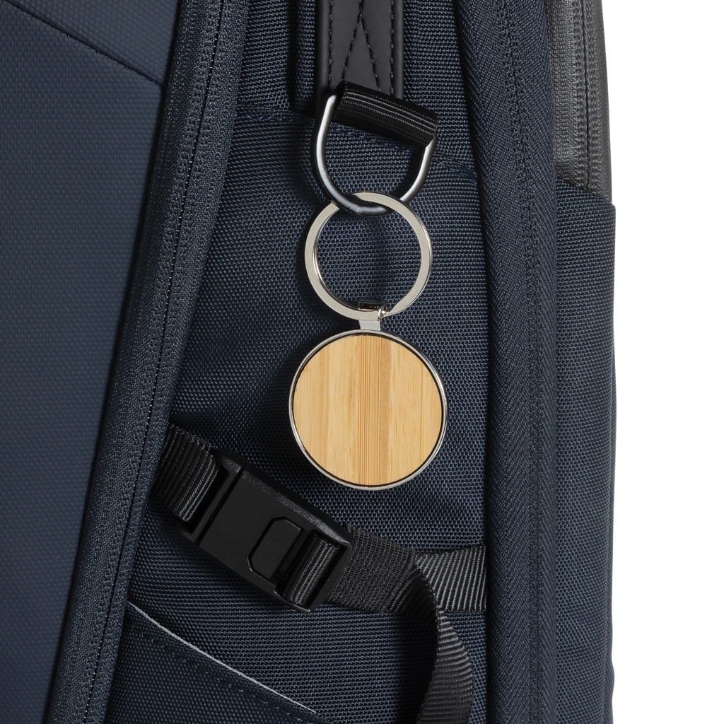Logotrade profilreklam bild: Rund nyckelring i RCS återvunnen zinklegering med bambu