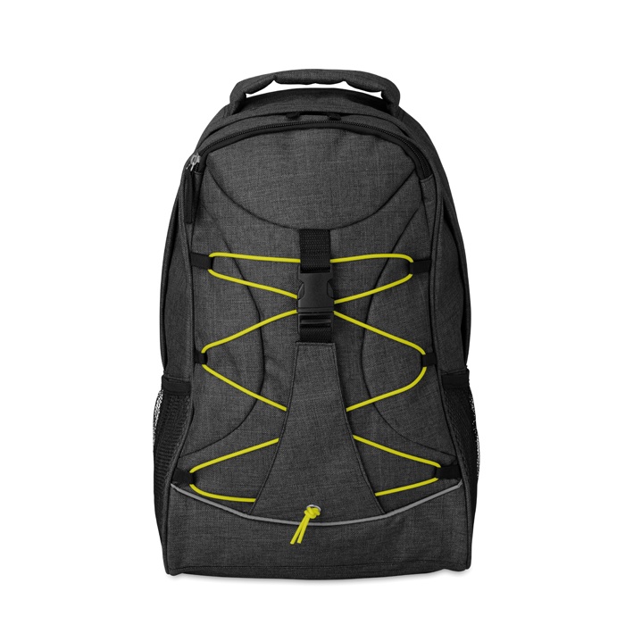 Ryggsäck i melerat 600D polyester med färgglada kontraster och reflexband. Meshficka på båda sidor och spännband på fronten för praktisk förvaring.