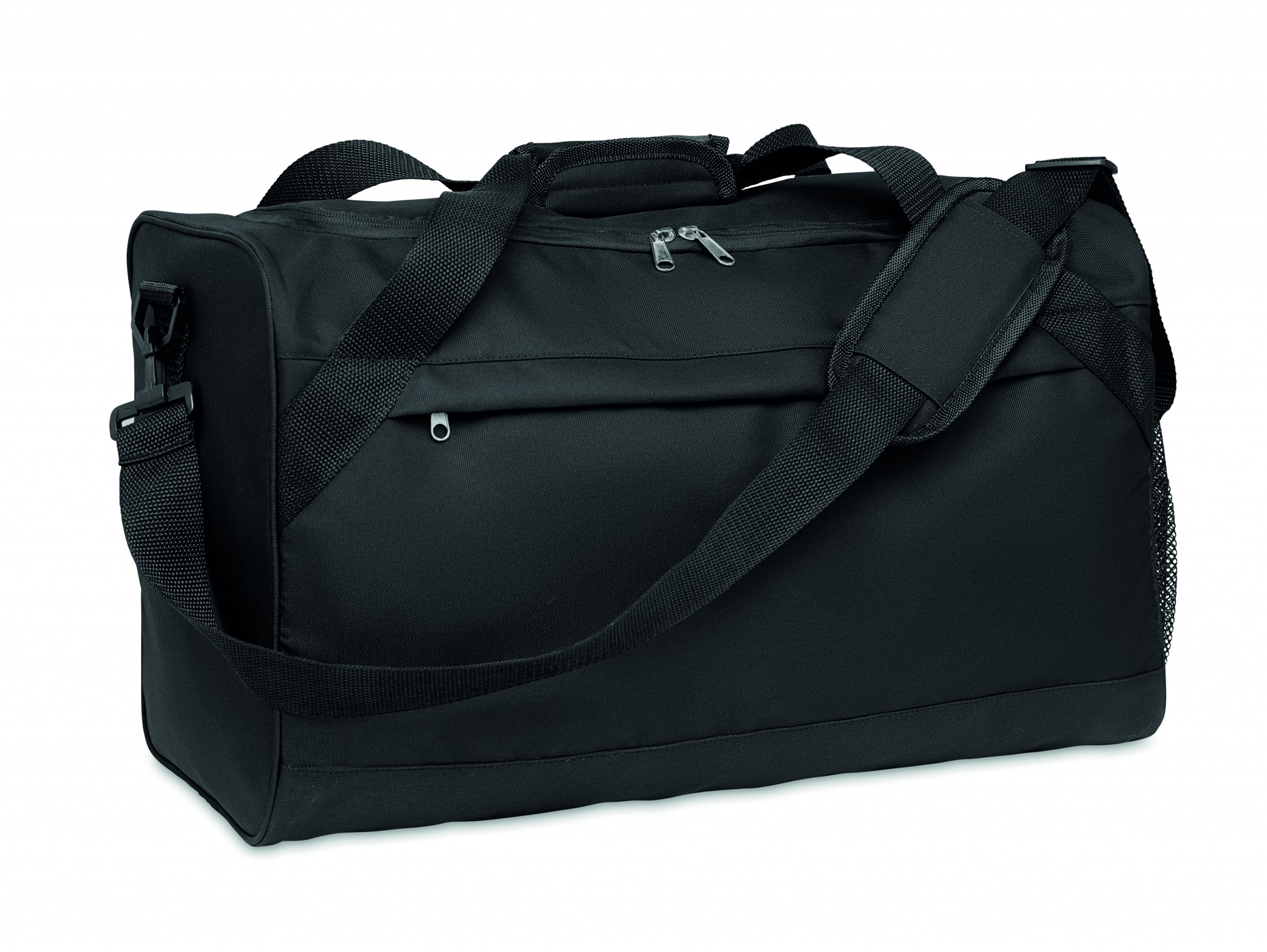 Sportväska i 600D RPET med stor framficka med dragkedja, innerficka med dragkedja och justerbart samt avtagbart axelband.