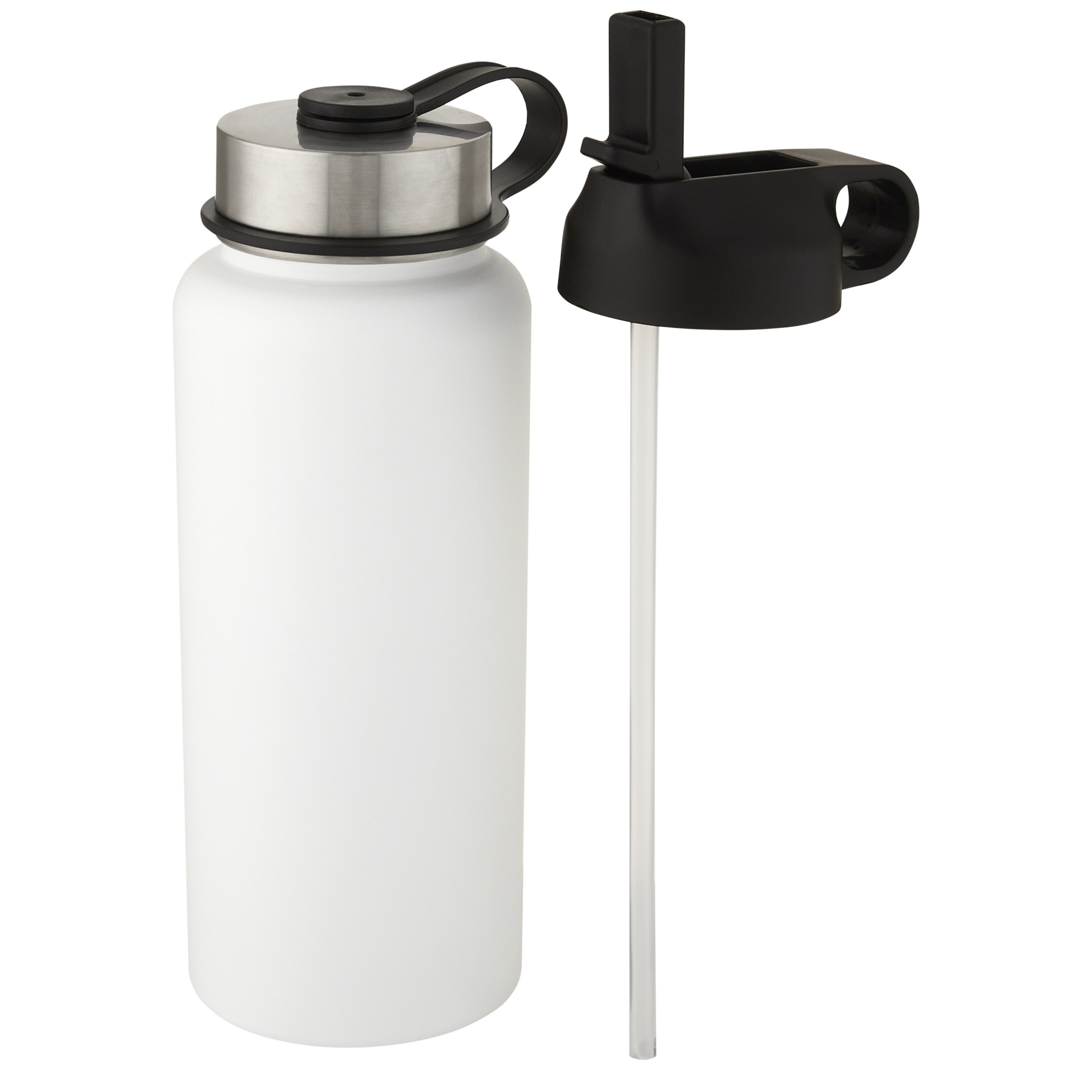 Två-i-en sportflaska med dubbelvägg i rostfritt stål med vakuumisolering i koppar med två lock: ett lock med sugrör för att lätt kunna dricka och ett läckagesäkert skruvlock med hanteringsloop. Den isolerade 18/8 rostfria stålkonstruktionen förhindrar kondens på utsidan av flaskan och den trendiga pulverlackeringen gör den extra hållbar. Mynning med bred öppning för enkel påfyllning, hällning och rengöring. BPA-fri, testad och godkänd enligt tysk lagstiftning om livsmedelssäkerhet (LFGB). Testad och godkänd för ftalatinnehåll enligt REACH-förordningarna. Perfekt för isbitar. Volymen är 1 liter. Handdisk rekommenderas. Levereras i en återvunnen presentförpackning av kartong.