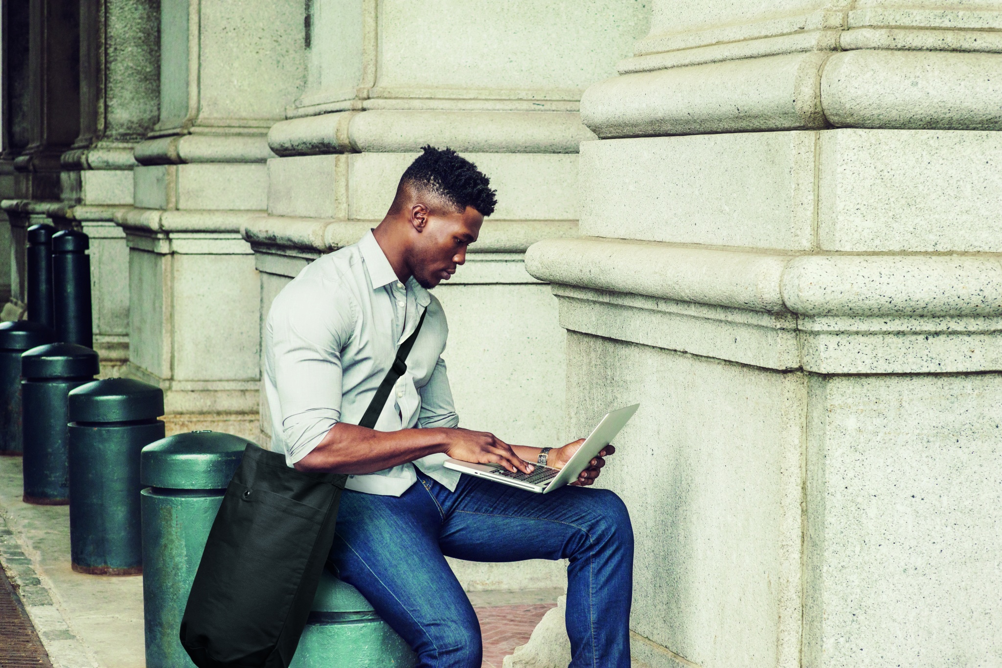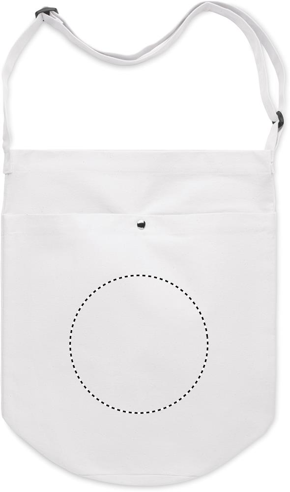 Kasse i canvas med lång justerbar axelrem och stor framficka med snäpplås. Inkluderar innerficka. 270 gr/m².