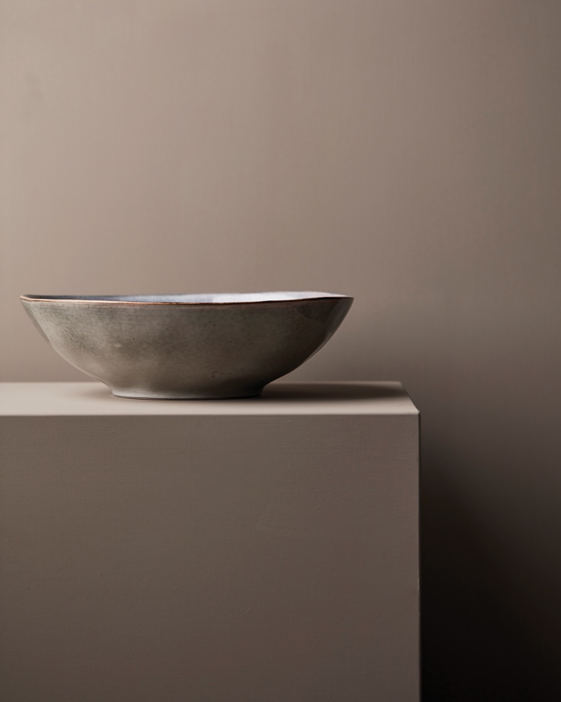 Härlig serveringsskål i stengods med en högre, handgjord, kant som därför blir elegant ojämn. Perfekt till en underbar nudelsallad eller som varför inte servera en pastarätt. Japanskt möter skandinaviskt, rustikt möter modernt. Nomimono har sin källa i naturen och jorden runt om oss, vilket gett inspiration till denna rustika serie i naturnära, jordiga toner där inget objekt är det andra likt. Varje produkt är skapat i handgjort stengods som glaserats tre gånger för rätt finish. Det gör varje produkt unik, vilket också är en stor del av Nomimonos charm. Samlarobjekt för en jordnära och inspirerande servering. Diskmaskin-och mikrovågsugn säkra.