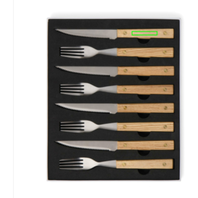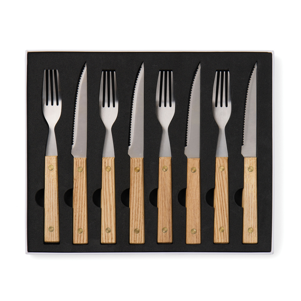 Duka upp med detta tidlösa BBQ-bestickset i 8-delar, designat med skandinavisk enkelhet och funktion i åtanke. Setet, tillverkat av FSC®-certifierat askträ och högkvalitativt rostfritt stål, innehåller fyra knivar och fyra gafflar, alla med ett bekvämt grepp. Dessa bestick är inte bara ett nöje att använda, utan också ett stilfullt inslag vid varje grillning eller middagsbjudning.