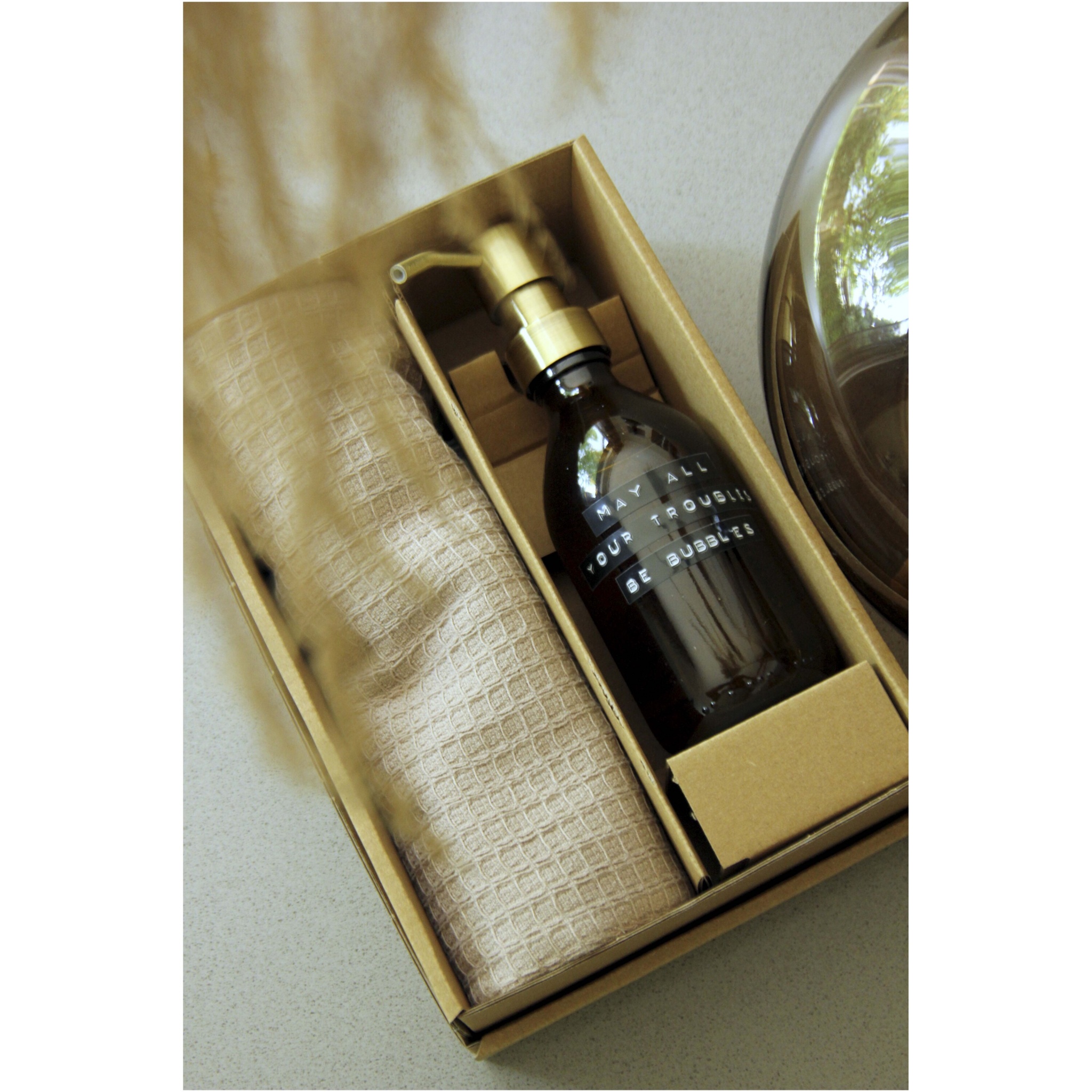 Presentset med en 250 ml bambudoftande handtvål och en beige kökshandduk av ekologisk bomull. Detta set är perfekt som present för alla tillfällen.